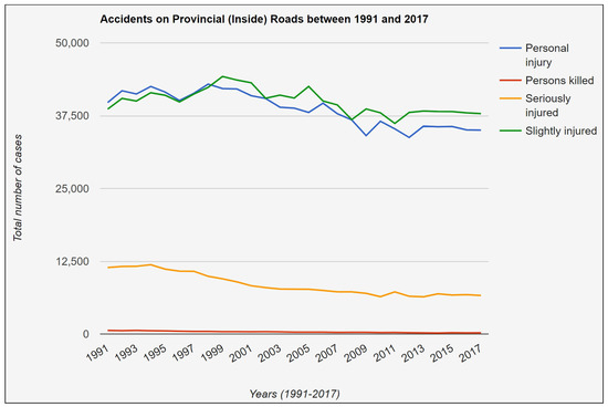 Figure 22. Levels of injuries that occurred on provincial roads inside the built-up areas (1991–2017).