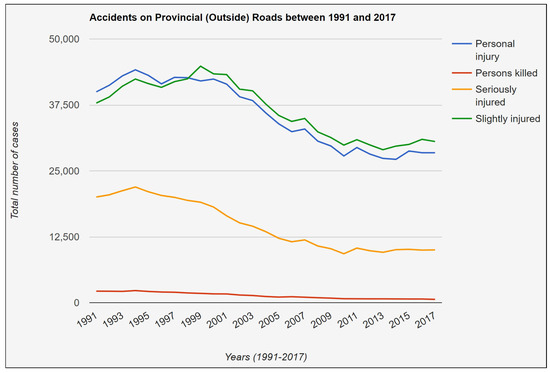 Figure 23. Levels of injuries that occurred on provincial roads outside the built-up areas (1991–2017). - Analysis on the Federal Motorway: The federal motorway (Bundesautobahn) is the federally-controlled-access highway system throughout all of Germany. For some classes of vehicles, this motorway has no speed limit, which makes it unique and popular throughout the world. Figure 24 presents the recorded data of federal motorways; it is observed that the number of personal injuries was decreasing up until 2012; then, it began to grow; since then, the number of personal injuries was increased in 2017. Similarly, the people who were slightly and severely injured or died in a road accident have also increased in 2017.