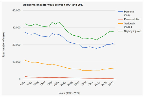 Figure 24. Analysis of injuries that occurred on motorways (1991–2017).The reason might be the increasing economic activity, as Germany is now the world’s fourth largest and Europe’s biggest economy. The most visual proof of its financial activity is the number of large logistics vehicles that carry goods and supplies to-and-fro, on its highways and motorways. In order to postulate a more convincing theory, further analysis of this subject is required.
