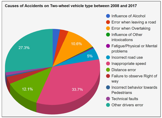 Figure 25 presents the 12 most common reasons for an accident of a two-wheel vehicle on the roads. In Germany, there are many different types of two-wheel motor vehicles, but they all have to comply with these rules: the driver must always wear a helmet, must have insurance, and must have reached the minimum required age for driving [22]. Despite the effective implementation of these rules, accidents do occur, and, out of the 12 above-mentioned causes, inappropriate speed is the biggest reason, resulting in of all accidents, which is one-third of all incidents involving two-wheel vehicles in the last 10 years. It has also been analyzed that the accident is not always the fault of a driver him/herself. Many times, it is another driver’s mistake that costs lives. As it is observed in Figure 25, the second most common reason for a road accident in this category is ‘other driver’s error’, which accounts for of all such accidents in the last 10 years. In third place is the ‘distance error’, which accounts for of all such accidents; therefore, it is very important to keep a safe distance from the vehicle in the front. This is followed by an error when overtaking another vehicle, and incorrect use of the road, in fourth and fifth positions, respectively.
