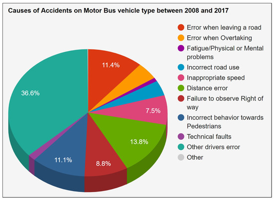 For further analysis, the other two modes of transportation on the road, i.e., public buses and goods transport vehicles, are considered. Mobility is the cornerstone of any modern society and the fuel for a thriving economy. In most European countries, the public at large use motor buses as their daily conveyance. Therefore, it is significant to note the fundamental causes that result in road accidents involving public buses. Figure 27 presents the fact that , or more than one-third of all accidents involving motor buses occur due to ‘another driver’s error of judgment’. This is something very ironic—that even one person’s slight mistake while he or she is in the driver’s seat can, knowingly or unknowingly, affect so many other lives. Hence, strict implementation of driving rules and regulations is extremely necessary for any society. The second biggest cause, which appeared the last two times as well, is ‘distance error’, making up of accidents involving motor buses. The other important reasons include ‘the error when leaving the road’, ‘incorrect behavior towards the pedestrians’ and ‘failure to observe the right of way’.