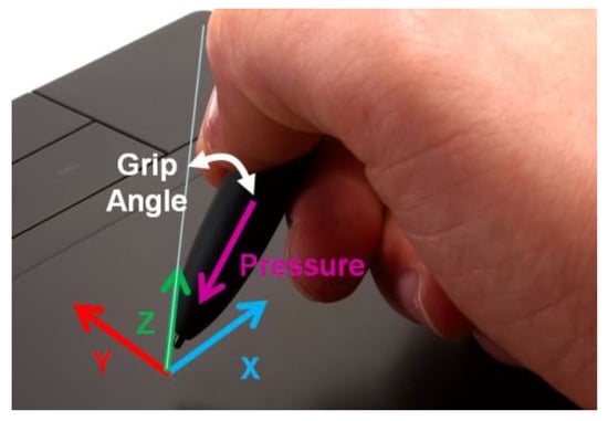 We used a public dataset: the Parkinson Disease Spiral Drawings Using Digitized Graphics Tablet dataset [27]. This dataset includes spiral drawings from 77 people, 62 with PD and 15 healthy people in the control group. The dataset was recorded using the Wacom Cintiq 12WX graphics tablet [29]. This tablet allows showing a PC’s screen on its display and interacting with a digital pen. In total, five time-series were recorded for each drawing. Every recording includes information about X-Y-Z coordinates, pressure, and grip angle (Figure 1) obtained from the API functions of the device.