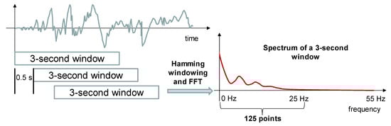 The dataset was obtained in two phases with two different sampling rates, 110 Hz and 140 Hz. In order to have uniform data, all the recordings were resampled to the same sampling rate of 110 Hz. The sample sequence was divided into 3-second windows (330 samples per window) separated by 0.5 seconds (it means a 2.5-second overlap between two consecutive windows). All the windows from PD subjects were labeled as class 1 and all 3-second windows from healthy subjects were labeled with class 0. Each window was expanded to 512 points using zero padding. After that, the module of the Fast Fourier’s Transform (FFT) was obtained using a Hamming windowing. As the FFT is symmetric for real signals, a 256-point representation of the spectrum was obtained in the 0–55 Hz frequency range. From this representation, we selected the first 125 points of the spectrum corresponding to the 0–25 Hz frequency band because the energy in the frequency spectrum above 25 Hz was negligible, less than 1% of the total energy. Figure 2 represents the preprocessing carried out to all signals recorded from each drawing (five signals in total). As a result of this preprocessing step, five spectra of 125 points were obtained for every 3-second window.