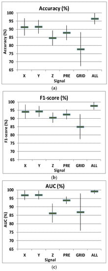 Figure 4 shows mean and standard deviation of accuracy (a), F1-score (b), and AUC (%) (c) for the subject-wise five-fold cross-validation. The two most informative signals were the coordinates X and Y. When using all the signals, the system reported an accuracy of 96.5%, F1-score of 97.7% and an AUC (%) of 99.2%.