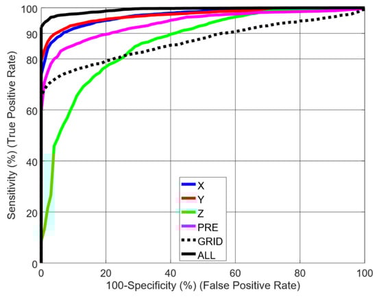 Sensitivity vs. specificity curves for every signal independently: X, Y, and Z coordinates, pressure (PRE), and grid angle (GRID) and including all the signals together (ALL).