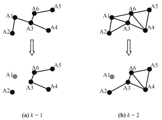 Figure 1a, the failure nodes A1, A2, and A3 cause nodes A4, A5, and A6 to no longer connect to other nodes, which divides the network into two disconnected subnetwork, whereas the occurrence of failure nodes B1, B2, and B3 in