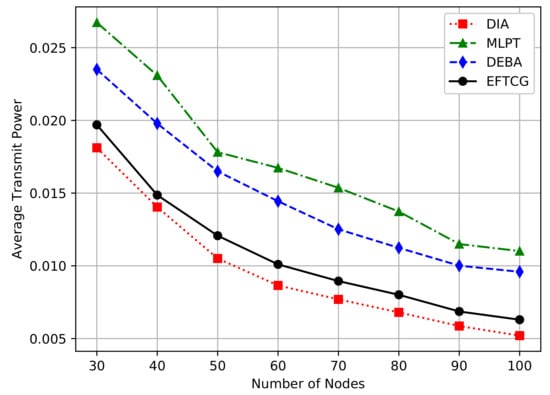 Figure 6, the average transmit power decrease with the increase of the number of nodes. Compared with MLPT and DEBA algorithms, EFTCG algorithm has lower average transmit power, but EFTCG consumes slightly more power than DIA. DIA only aims at minimizing power, so nodes can get the lowest transmit power. Compared with the DEBA algorithm, the EFTCG algorithm has better performance in reducing network energy consumption by reducing transmit power.