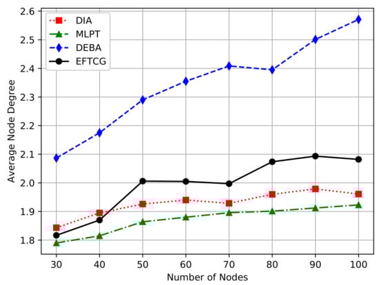Figure 7, the average node degree becomes large as the node density increases. The DEBA algorithm tends to make nodes communicate with other nodes with more residual energy, so it has the highest degree. In the EFTCG algorithm, when a node has much energy, it may increase its transmit power within the affordable range to select the neighbor nodes with more residual energy to forward data, so the average degree is higher than DIA and DEBA. The degree of EFTCG is relatively moderate, which not only does not consume too much energy but also can forward data efficiently.