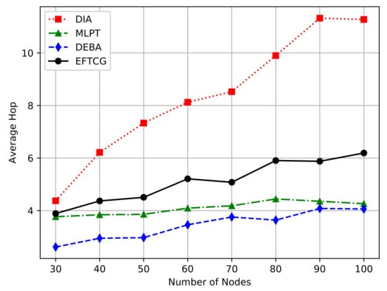 Figure 8 shows a comparison of the average-hop under the shortest path between an ordinary node and a sink node. As the number of node increase, the average-hop increases. The average-hop of EFTCG is slightly higher than of DEBA and MLPT, but lower than DIA. Under the topologies of DEBA and MLPT, the average transmit power of nodes are higher, the communication radius of their nodes is also relatively large. So the number of nodes passing through when reaching the sink node is relatively small at the same distance. Since the node of EFTCG operates at lower power, it is inevitable to increase its hop count from source to destination.