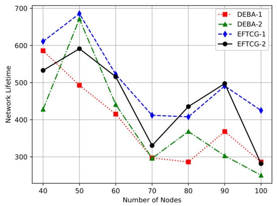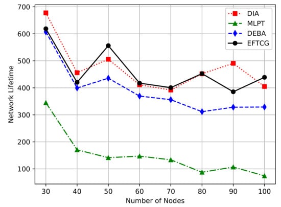 32]. As the number of nodes increases, the network lifetime decreases gradually. The network lifetime of EFTCG and DIA is better than the other two algorithms, and there is little difference between them. EFTCG effectively balances power and energy, so it has low power and moderate node size, which significantly prolongs the network lifetime. The complexity of DIA is