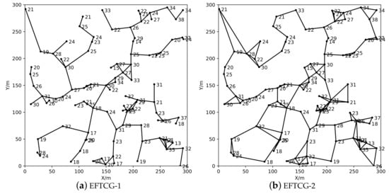 Figure 12a shows that the survival nodes decrease with the increase of the number of failure nodes in one experiment simulation, and the EFTCG-2 algorithm decreases more smoothly, whereas the other two algorithms fluctuate more.