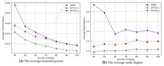 Figure 11a, when the number of nodes is small, the average transmit power of EFTCG-2 is higher than EFTCG-1 and DEBA, but as the number of nodes increases, the average transmit power is equal to the DEBA. EFTCG-2 makes the node properly increase its transmit power to add links to maintain the network biconnectivity, so that its average transmit power is the highest, which makes that its average node degree is also larger than others in