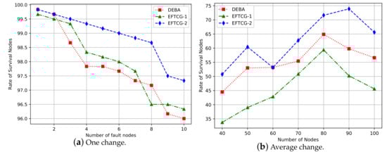 Figure 12b indicates that the variation of the rate of survival nodes under a different number of nodes after ten failure nodes appear in the network, and EFTCG-2 has more survival nodes than EFTCG-1 and DEBA. As shown in