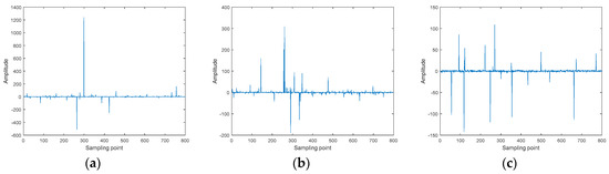 Time-domain waveform diagrams of impulsive noise under different conditions: (a) Cauchy noise with α = 1; (b) standard symmetric α-stable (SαS) noise with α = 1.2; (c) mixed Gaussian noise.