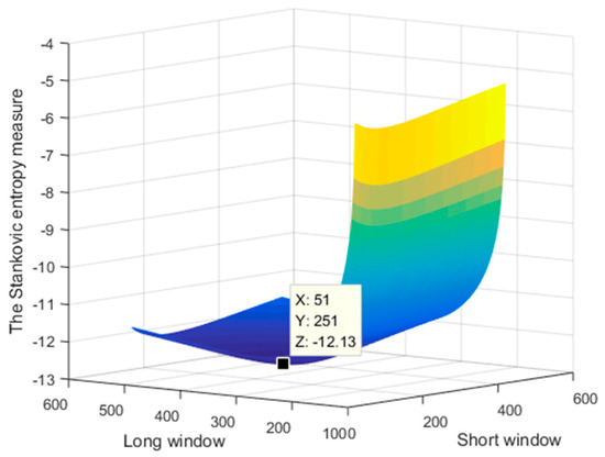where denotes the signal entry of time-frequency distribution that is affected by the length of the window function. The smaller the value of , the better the time-frequency performance and the more optimal the length of the window function.