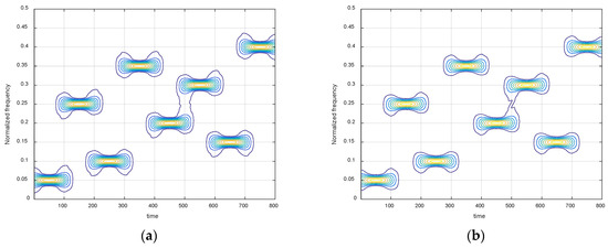 Computer simulations were conducted to investigate the performance of the derived estimator. The signal is generated by Equation (4), where the parameters in the FH signal are set as follows: eight hopping periods with , the sampling rate = 10 kHz, the sampling point N = 800, the hopping frequencies = {0.5, 2.5, 1, 3.5, 2, 3, 1.5, 4} kHz, and the noise being standard SαS noise with α = 1.5, β = 0, γ = 1. Since impulsive noise has no finite second-order moment, the generalized signal-to-noise ratio (GSNR) [27] will be more applicable than the traditional signal-to-noise ratio, and is set to 3 dB. The order of ℓp-STFT satisfies 1 < p < 2, p = 1.2, the explanation for p is given in Appendix A, and the tolerance is taken as ε = 1 × 10−4. All results were simulated using MATLAB running on Intel(R) Core(TM) i7-4790 CPU@3.60 GHz and Windows 10 for observations.