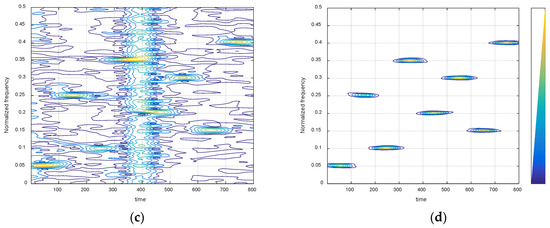 Time-frequency spectrograms of STFT with different window functions in impulsive noise. (a) Initial spectrogram with narrow window function; (b) spectrogram of ℓp-STFT with narrow window function; (c) initial spectrogram with wide window function; (d) spectrogram of ℓp-STFT with wide window function.