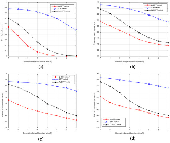 Third, we selected the algorithms related to the STFT to compare the performance of parameter estimation: STFT, FLOSTFT, and ℓp-STFT. The FLOSTFT method represents a class of algorithms based on fractional low-order statistics, and the fractional lower moments assumes p = 0.4. After repeating 100 experiments on these three methods in α-stable noise with α = 1.2, β = 0, γ = 1, we compared the relative error of hopping period and the mean squared error (MSE) of hopping frequency to evaluate their parameter estimation performance.
