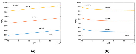 According to the proposed stability constraint for the control parameter for BDC determination, the large signal stability boundaries of various control parameter kp, filter capacitor C and filter inductor L can be obtained as shown in Figure 4. It is obvious that in Figure 4 the large signal stability is improved when the BDC control parameter kp increases.