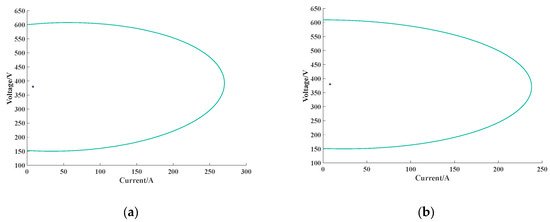 The RAS of the system in the case of battery charging and discharging shown in Figure 5 identifies that the proposed control parameter determination method could improve the system stability effectively. The RAS in the case of battery charging contains the stable equilibrium point (7.89 A, 379.8 V), and is large enough (the voltage varies from 150 V to 610 V, current varies from 0 A to 270 A). The RAS in the case of battery discharging contains the stable equilibrium point (7.89 A, 379.8 V), and is large enough (the voltage varies from 150V to 610V, current varies from 0A to 240 A).