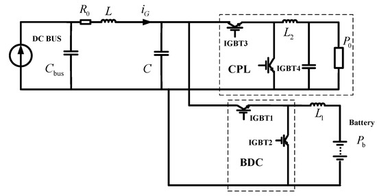 Considering the different characteristics of each subsystem, the source converter is reasonably simplified to a current source iG, the closed-loop controlled load converter is equivalent to CPL P0, the BDC is equivalent to an impedance RB in the case of battery charging, which is regarded as a current source PB in the case of battery discharging. Under the regulation of the BDC, the voltage of bus capacitor is maintained at the reference value, and the DC bus exhibits the characteristics of a voltage source. The simplified system is shown in Figure 3.
