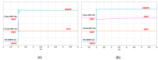 The simulation results are shown in Figure 8. In Figure 8a,b, the large disturbances are the same, both in the cases of power variations from 500 W to 5000 W. Comparing Figure 8a with Figure 8b, when the control parameters of the system meet the obtained constraints, the voltage of the DC bus could return to the reference 380 V as shown in Figure 8b. While the control parameters do not meet the constraints, the voltage of DC bus drops to 195 V and cannot return to the steady-state operating point as shown in Figure 8a. Based on the comparisons of Figure 8a,b, the proposed control parameter determination method for BDC based on large signal stability can improve the stability of the DC-MG as shown in the simulation results.