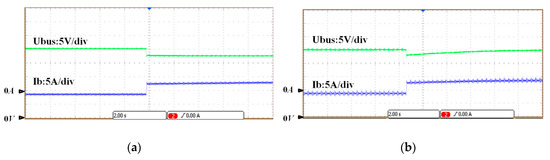 The experiment results are shown in Figure 9. In Figure 9a,b, the large disturbances are the same, in both cases of power variations from 20 W to 100 W. Comparing Figure 9a with Figure 9b, when the control parameters of the system meet the obtained constraints, the voltage of the DC bus could return to the reference 50 V as shown in Figure 9b. While the control parameters do not meet the constraints, the voltage of DC bus drops to 45 V and cannot return to the steady-state operating point as shown in Figure 9a. Based on the comparisons of Figure 9a,b, the proposed control parameter determination method for BDC based on large signal stability can improve the stability of the DC-MG as shown in the experimental results.