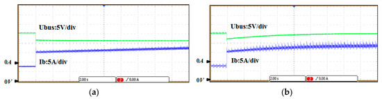 In this section, experimental verification is reported in order to verify that the control parameter determination for BDC could improve the system stability effectively. In the experimental rig, the DC bus voltage is 50 V, the power of CPL steps from 20 W to 100 W, the filter inductor L is 1 mH, and the filter capacitor C is 4700 μF. Two groups of control parameters for BDC shown in Table 2 are adopted to verify the effectiveness of the parameter determination method. The control parameters for BDC in the case of battery charging can be obtained based on Equation (18).