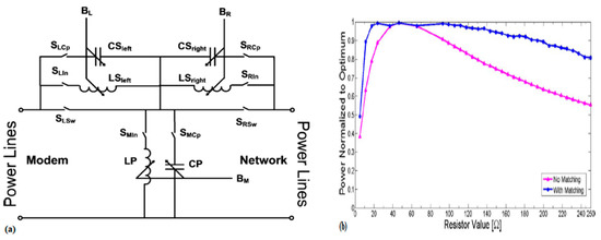 where is the input impedance of the power line channel, is the source internal impedance and is the complex conjugation of . In Equation (7), when , the power reflection coefficient is minimized (). In other words, when the modem (receiver/receiver) impedance is equal to the complex conjugate of the input power line impedance, the maximum power transfer is achieved. Based on the complex conjugate matching method, the authors of Refs. [69,70,71] designed a broadband impedance matching (BIM) circuit to maximize the power transfer.