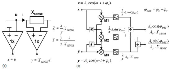 (a) Sensing circuit used for measuring RF voltage and current information [44]; (b) Generic quadrature detector used for providing the real and imaginary parts of the detected impedance [44].