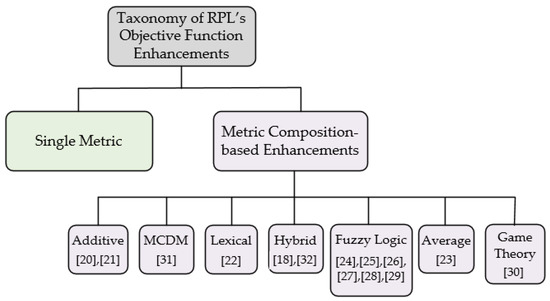 There are also some other enhancements on RPL objective functions, in which metric composition is based on Game Theory [30] and MCDM [31]. These improvements are basically for congestion control in LLNs. Different routing metrics are used to calculate the rank of a node in a network. Each child node uses a potential game theory-based strategy to select the best parent. Similarly, the parent selection process can be developed as a multi-criteria decision making (MCDM) problem by combining different routing metrics.