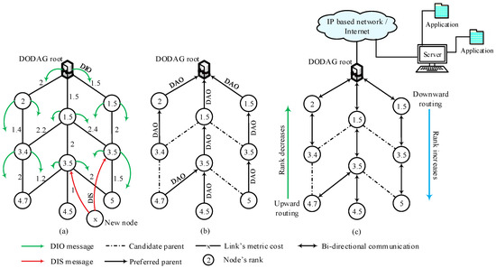 Route building operation; (a) DIOs multicast initiated by destination oriented directed acyclic graph (DODAG) root (LBR) and rank calculation. New node intend to join the network; (b) propagation of DAOs to build the downward routes; (c) complete DODAG with both upward and downward routes.