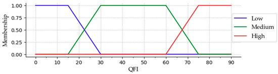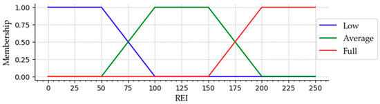 Figure 4 shows the membership function for the fuzzy variable ETX. In general, the membership value for the respective fuzzy variable is determined based on several trialing [39]. Simulation tests determine the minimum, maximum, and average values of these variables experimentally. The key points of the membership function can be computed based on the upper limit of the network criterion. In this work, the maximum ETX value is determined as 15. As depicted in Figure 4, Figure 5 and Figure 6, the fuzzy values are computed through the membership functions of the fuzzifier. For Instance, if the ETX value in DIO is 3, and then the corresponding membership value of ETX variable is [1, 0, 0]. ETX is the member of three set {Short, Average, Long} → {1, 0, 0}. Accordingly, the ETX value 3 can be only considered in ‘Short’ set. Similarly if the ETX value in DIO is 4.5, then the membership value is [0.50, 0.50, 0] → {Short, Average, Long}. In this case, ETX value 4.5 can be considered in ‘Short’ and ‘Average’ set. The ETX value that lies between 6 and 9, the membership function is of 1, which is [0, 1, 0] and considered in ‘Average’ set. Likewise, if the ETX value is 10, then the corresponding membership value is [0, 0.65, 0.35]→ {Short, Average, Long}. Here, the ETX value 10 can be considered in ‘Average’ and ‘Long’ set. The same reasoning holds for any other ETX value. In this way, QFI and REI are classified into three linguistic variables, as shown in Figure 5 and Figure 6.