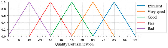 After the fuzzification step, the next important step is the fuzzy inference, which is used to combine the fuzzy rules from the rule base. After establishing all the rules, the defuzzification will be the next step. It is the process of producing a fuzzy output value from the given fuzzy sets and corresponding membership degrees to produce a crisp value. In our defuzzification step, we use centroid defuzzifier. It is the most commonly used method that returns the center of gravity of the fuzzy set. We determine the membership function of each output variable of parent quality, as shown in Figure 7. The output of the defuzzifier can be obtained while using Equation in (12).