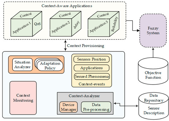 The context-analyzer manages low-level communications with context sources and provides source discovery and configuration services. The context source uses the data repository to describe itself in terms of identity, attributes, and functionality. The context analyzer preprocesses raw context data into advanced context information events. It also analyzes the nodes’ status, such as battery level. Based on the information that was supplied by the context-analyzer, context events are prepared: sensed phenomena and node position. The context monitoring captures the relevant concepts and relationships that were required by the applications. It abstracts the raw data collected from the context information source. These raw data may need to be pre-processed to obtain the forms defined by the situation analyzer. After being pre-processed, this raw data should provide the necessary high-level context information. The smart devices that generates data in the application layer that is based on the context (QoS, delay, reliability) that are analyzed by the functional model of COOF.
