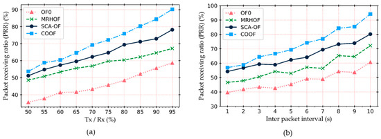 Packet reception ratio: the number of packet received by the root node per unit time. We set the inter packet interval to two seconds and evaluate the packet reception ratio (PRR) with respect to different transmission success ratio (Tx) and receiving success ratio (Rx). For this, we only consider data packets. Congestion may occur on a parent node because of high and dynamic traffic flow from many sensing devices. Consequently, the data packets may drop due to queue limitation. The backlog situation leads to a smaller number of data packets being received at the root node and, hence, the packet reception ratio declines. Figure 10a shows the packet reception ratio of OF0, MRHOF, SCAOF, and COOF with respect to the Tx/Rx ratio. It can be seen that the packet reception ratio is high under high transmit success ratio and receive success ratio. The result shows that the packet reception ratio of all objective functions is gradually increasing with the increasing of the Tx/Rx ratio. However, COOF achieves the higher packet receiving ratio than others under high and dynamic traffic scenarios. Conversely, as compared to COOF, SCAOF, and MHROF, OF0 lost most of the packets in the buffer. It is expected because OF0 does not include the link quality metric in the path selection process. On the other hand, in COOF, along with link quality metric, queue utilization and energy metric are also taken into account, during path selection. As transmit and receive success ratio reflect the quality of the link in the network. Therefore, when Tx/Rx is low, the quality of the link is poor, and thus the re-transmission of the packet causes the packet loss problem, and hence a decrease in packet receiving rate.