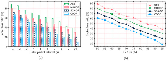 Packet loss ratio: it is the ratio of the total number of data packets lost due to the queue limitation to the total number of data packet sent. Figure 11a depicts the comparison of the packet loss ratio with respect to the Tx/Rx among different OFs. The result shows that the packet loss ratio decreases as the Tx/Rx ratio increases. However, as compared to other, COOF loses fewer packet due to the queue limitation. It is obvious, because COOF takes into account queue fluctuation index metric to properly handle the queue overflow issue on a node. At the low Tx/Rx ratio, 50%, the packet loss ratio of OF0, MRHOF, SCAOF, and COOF are about 89.4%, 79.6%, 71.2%, and 60.7%, respectively. In addition, Figure 11b shows the packet loss ratio with respect to the inter packet arrival interval. When the packet arrival time is short, COOF can handle the packet in the queue effectively and reduces the packet loss ratio. In particular, when the packet arrival interval is 1 and 2 second, COOF reduces the packet loss ratio by approximately 10.9% as compared to SCAOF. The reason for the performance improvement of COOF is that it reacts more accurately to dynamic traffic than others.
