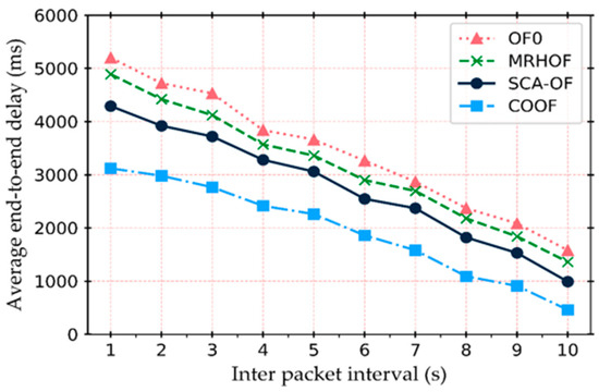 Average end-to-end delay: It represents the average time difference between the time when the data packet was sent and the time when the data packet was received at the root node. The average end-to-end delay has been evaluated under different inter-packet interval, as shown in Figure 12. The result shows that, as compared to other, COOF achieves the lowest packet delivery delay. The average delay in OF0 is significantly greater than MRHOF, SCAOF, and COOF. It was obvious, because OF0 could not deliver data packets on time and it has to be in the queue for a long time when there was heavy traffic. In contrast, the COOF can handle the traffic dynamicity efficiently and it performs better. When data traffic is high, COOF is aware of resources in terms of queue utilization, and thus traffic is routed through the less congested parent node. As a result, the packets are not queued in the node’s buffer for a long time.