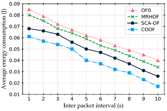 Energy consumption: it is defined as the average residual energy of nodes in the network. It represents the application that requires priority in terms of lifetime. The total energy consumption is the sum of the energy consumed due to the reception and transmission of per successful packet from source to the destination. Figure 13 shows the average energy consumption in the network with respect to different inter-packet interval. The energy consumption of COOF is significantly lower than other approaches. It is because COOF loses fewer packets in the queue, and thus minimizes the re-transmission of packets. In addition, REI gives the better understanding of the network situation during parent selection. As retransmission is high in OF0, MRHOF, and SCAOF, so sending and receiving lost packets due to buffer overflow is necessary and thus waste energy. Moreover, OF0 and MRHOF do not include any energy metric thus performing poorly as compared to SCAOF and COOF.