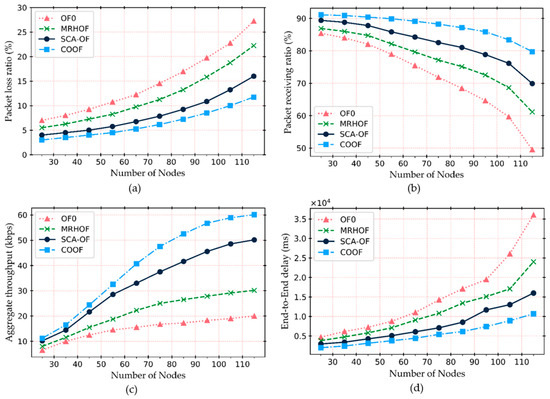 As shown in Figure 14a, the packet loss ratio of all objective function increases with the network size. The packet loss ratio of OF0 and MRHOF is relatively high, as compared to others, it is because of the routing metric used during parent selection. Under our proposed OF, queue fluctuation at each node is considered to be a routing metric during path selection. Thus, the packet loss rate significantly reduces in COOF than default OFs. In contrast, SCAOF, MRHOF, and OF0 are unable to be aware of backlog packets at the node’s buffer. As a result, a node may select preferred parent that is suffering from buffer overflow. As the network size increases, the packet loss tendency becomes more severe. In this situation, SCA-OF, MRHOF, and OF0 experience 16%, 22%, and 28%, respectively, whereas the COOF is less than 15%. The experimental results show that the composite metric scenario yields better results in the packet loss rate than the default RPL OFs.