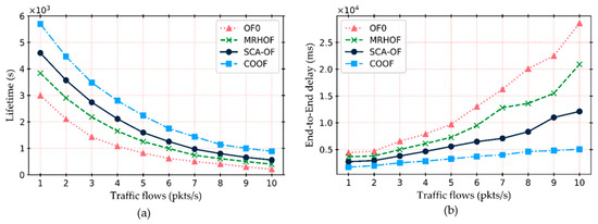 The impact of the traffic load variation: (a) network lifetime with respect to different traffic flows, and (b) end-to-end delay in millisecond with respect to different traffic flows.