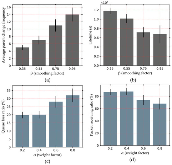 The effect of the design parameters on performance; (a) average parent change frequency with varying smoothing factor β, (b) lifetime in seconds with varying β, (c) queue loss ratio with varying weight factor α, and (d) packet receiving ratio with varying α.
