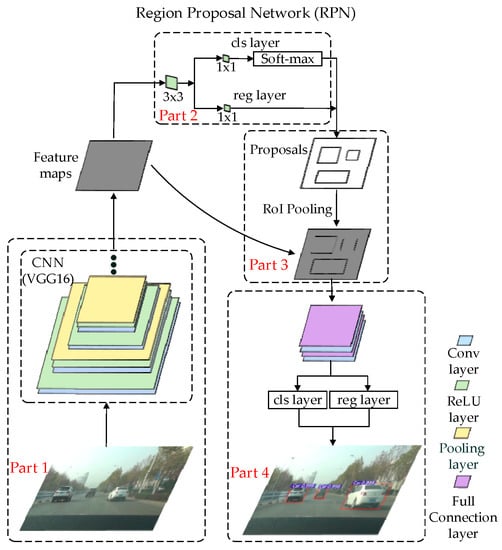 The dominant paradigm in modern object detection is based on a two-stage approach: The first stage generates a sparse set of candidate proposals that should contain all objects while filtering out the majority of negative locations, and the second stage classifies the proposals into foreground/background classes and predicts proposal locations [35]. Faster R-CNN is a classical two-stage algorithm due to its efficient proposal extraction design. As shown in Figure 1, the overall structure of the Faster R-CNN algorithm is mainly divided into four parts: (1) Image feature extraction, corresponding to using VGG16 network model [36], a stack of basic convolutional (conv; 13 layers) + rectified linear unit (ReLU) activation function (13 layers) + pooling (4 layers) layers [37] is used to extract the input image features, and feature maps are used in the subsequent RPN and region of interest (RoI) pooling; (2) RPN: According to the feature maps input from the previous layer, RPN determines the object candidate proposals, which are the rough position of the object, including a rectangular box for proposals by the bounding box regression layer (reg layer), and the probability of object existence through the Soft-max function layer (cls layer) [38]; (3) RoI pooling: Proposal information and feature maps are collected, and proposals and feature maps are comprehensively extracted to get proposal features; (4) Classification and bounding box regression: According to the proposal features, the reg layer and cls layer are used to determine the object location and categories.