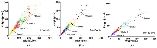 Clustering results of vehicle sizes: (a) at 0–20 km/h; (b) at 20–60 km/h; and (c) at 60–120 km/h.