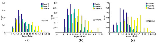 Proportion of vehicle aspect ratios in clusters 1, 2, and A at different speed stages: (a) 0–20 km/h; (b) 20–60 km/h; and (c) 60–120 km/h.