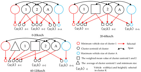When vehicle speed is 20–60 km/h, the cluster centroid of clusters 1, 2, and A is ,, and , respectively, the weighted mean value of the centroid of clusters 1 and 2 is , the minimum vehicle size of cluster 1 is , the maximum vehicle size of cluster A is , corresponding to Figure 8, and the vehicle sizes and aspect ratios R corresponding to each cluster are selected:
