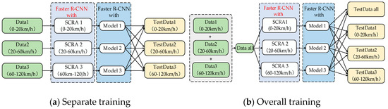 For the SCRA method, to verify the possible impact of the image data, as shown in Figure 11, data training of separate and overall training modes was adopted. For each training mode, redesigned anchors belonging to different speed stages were used to optimize Faster R-CNN; thus, there are three optimized Faster-RCNN algorithms corresponding to the three speed stages, Faster R-CNN with SCRA 1, Faster R-CNN with SCRA 2, and Faster R-CNN with SCRA 3, based on the data in Table 9. These algorithms were used for training; each optimized algorithm generated a detection model, Models 1, 2, and 3. Each model was used to test different test sets to verify the effect of this model.