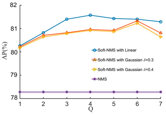 - With increased Q, detection accuracy increased continuously. For the optimized Soft-NMS with linear weighting, AP reached the maximum when Q = 4; for the optimized Soft-NMS with Gaussian weighting, AP reached the maximum when Q = 6, and δ had little effect on the detection accuracy. On the whole, the effect of the linear weighting penalty coefficient was better than that of the Gaussian weighting penalty coefficient.
