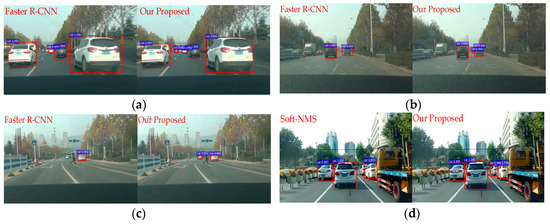 Figure 13 shows the test results based on the optimized Faster R-CNN algorithm using the SCRA method and the nonoptimized Faster R-CNN algorithm. Figure 13d shows the test results of occluded preceding vehicles based on the optimized Soft-NMS using the Q-SPC method and nonoptimized Soft-NMS.