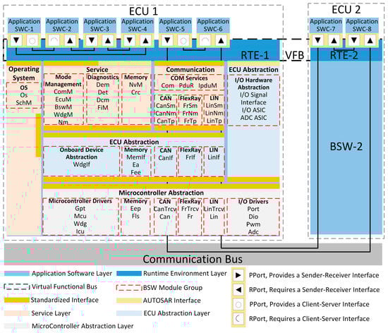 The RTE layer serves as a middleware for managing communication between the ASW layer and the BSW layer of the same ECU. The RTE provides the same abstracted interface regardless of whether the communication is within the ECU or through the external communication network, so the SWCs of the ASW layer are independent of those of the BSW layer. The VFB of the RTE layer provides the AUTOSAR communication mechanism for the client-server and sender-receiver interfaces and provides communication service to the SWC. The VFB is a technical concept that enables the development of the functional architecture of the entire system, independent of the actual hardware topology of the ECUs and the network []. In Figure 1, SWC-1 and SWC-2 communicate within ECU 1, but in the case of SWC-3 to SWC-6, communication is performed between the SWCs of ECU 1 and ECU 2. Since all SWCs are designed to communicate in one VFB, they are designed the same as SWC-1 and SWC-2 when developing SWC-3 to SWC-6, regardless of the position of the mapped ECU. After the SWCs are mapped to the ECU, the VFB is implemented as RTE-1 and RTE-2 in each ECU as shown in Figure 1. As a result, RTE-1 and RTE-2 play an individual role in VFB.
